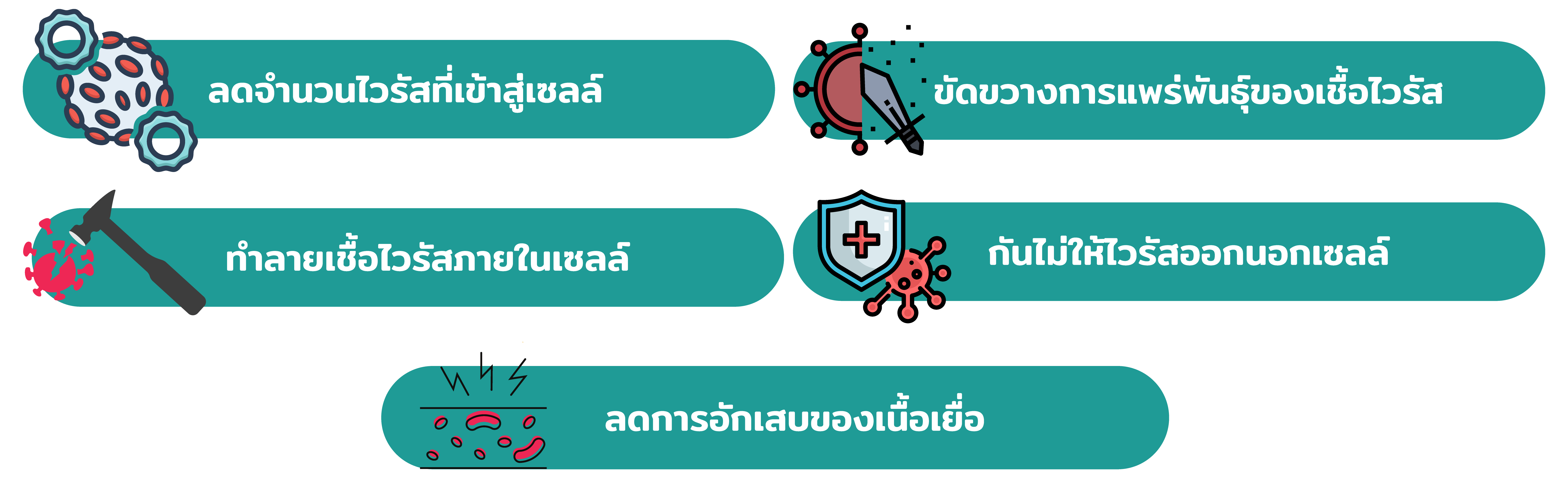 ลดจำนวนไวรัสที่เข้าสู่เซลล์, ทำลายเชื้อไวรัสภายในเซลล์, ขัดขวางการแพร่พันธุ์ของเชื้อไวรัส, กันไม่ให้ไวรัสออกนอกเซลล์, ลดการอักเสบของเนื้อเยื่อ
